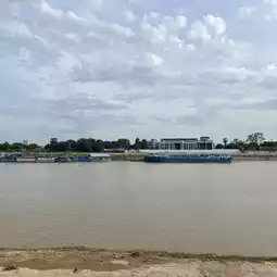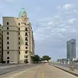 The surrounding area is lined with towering egg-colored buildings, giving it a European feel. While most of the buildings are abandoned, the atmosphere is rather quiet. However, once you pass through the grand and imposing Arc de Triomphe, things get lively. This area is a popular spot for viewing the Mekong River, and there's a long walking path where you can enjoy the breeze, admire the river views, and experience the local lifestyle, both fishing and fishing. The atmosphere is truly wonderful, perfect for those who enjoy a good atmosphere and photography.