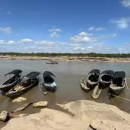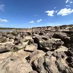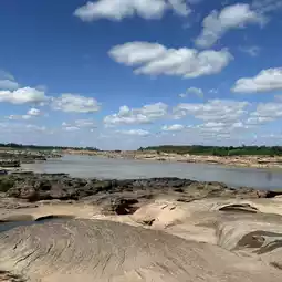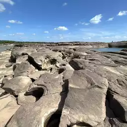 🪨Sam Phan Bok, Ubon Ratchathani Province During low tide, the view of the rocks that used to be submerged in the Mekong River will show its beauty. It is a beautiful and unusual natural view. Especially on a clear day, the brown, gray, and red rocks contrast with the blue sky and white clouds. Take a picture from any angle and it will be beautiful.