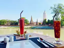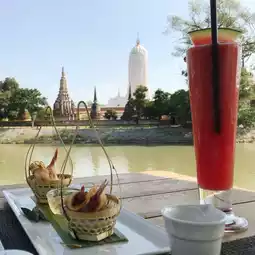You don't have to stay at Sala Ayutthaya to have food, drinks & snacks at Cafe… Sala Ayutthaya eatery and bar and Rooftop bar. Both of these zones welcome everyone with a view of the prang in Wat Phutthaisawan across the river as a background. Sometimes you can sit and watch many boats passing by, with different moods depending on the sunlight. It is considered a cafe with a million-dollar view that is truly worth coming to. 🥺