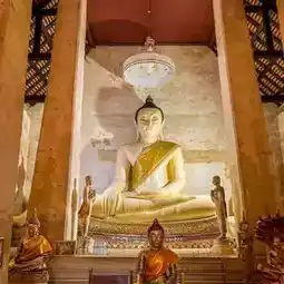 - Point 2 Pass through a small wooden archway. Behind is the 'Phra That Chedi'. The old ordination hall looks powerful. Go inside the ordination hall to pay homage to the Buddha image "Luang Pho Khao", the principal Buddha image in the ordination hall. The Buddha image is beautiful. You can ask for blessings for everything according to your beliefs. Ask for each person.