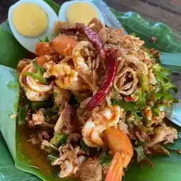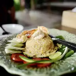Highlights -  fried rice with eggs, Vegetarian salad with spicy chili sauce, beautiful and peaceful atmosphere.