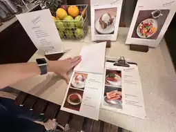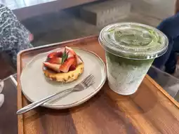 The menu includes tea, coffee, and fruit juices, as well as bakery items. Today, I ordered green tea. It had a milky aroma and the richness of the green tea scent. For dessert, I ordered strawberry cheesecake. It was delicious.