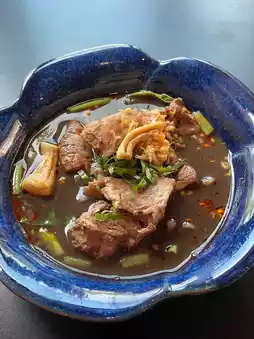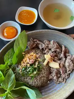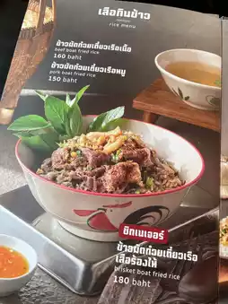 But today I will take you to eat the menu "Fried rice with crying tiger boat noodles" (180฿) and add pickled eggs! Let me tell you that I have never eaten this menu at any other restaurant. The taste is very spicy. It gives the feeling of boat noodles to the max. It is well-fried but a bit soggy. Those who like fried rice that is loose will not like that. The crying tiger meat is soft. It goes well with the pickled eggs. I really like the soup that they give me. It is well-rounded. I slurped the whole bowl. 😂