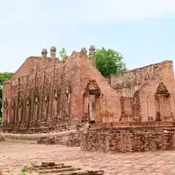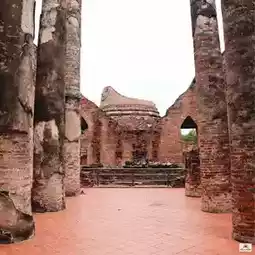 👍The large pagoda or the main pagoda of the temple is located behind the pagoda. It is currently in a state of ruin, meaning the spire is broken, leaving only a part of the bell-shaped body. On the circumambulation area, there are 8 pagodas in each direction. They are round bell-shaped pagodas on an octagonal base.