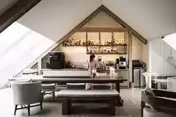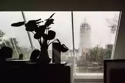 Clear glass windows with a view, delicious cake, comfortable atmosphere