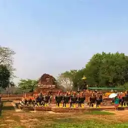 Today, we will take you to see an ancient temple with a large Buddha head in Ayutthaya. That is Wat Thammarat, formerly Wat Mukharat. It is a former royal temple during the Ayutthaya period. It has Ayutthaya architecture, a royal chapel, a large Buddha head. It is a temple with many chickens and is part of the Ayutthaya Historical Park.