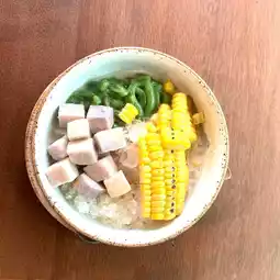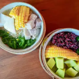 • Lod Chong with coconut milk and 4 toppings (cantaloupe, grilled corn, black sticky rice, and young coconut)