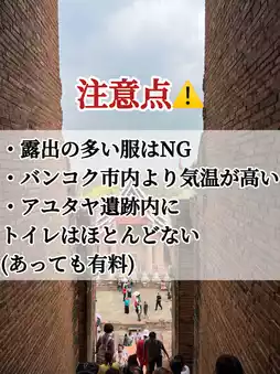 When visiting the Ayutthaya ruins, first of all, avoid wearing clothes that are too revealing! Also, the temperature is 2 to 3 degrees higher than in Bangkok city, and the humidity is extremely high, so be sure to take measures against the heat! !
