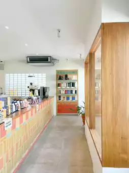 It is a homey-style cafe on the roadside, cute, with a warm feel. It looks like a house with both indoor and outdoor services. The atmosphere of the shop is decorated with trees that give a shady feeling and contrasts with the colors inside the shop with bright colors to create a comfortable mood. Sit and sip coffee, relax your mind and have fun.