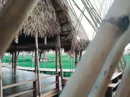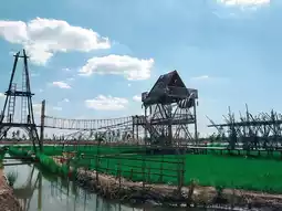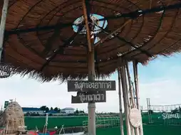In the shop, there is a food and beverage zone. There is a miniature train service to see around the shop in various corners. It's cute. There is a long winding wooden bridge in the middle of the rice field. There are many photo spots. The inside is open-air, airy, and has many seating areas to choose from. It's suitable for chilling out, sipping coffee, relaxing, taking photos, and checking in.