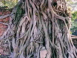 One of the Buddha heads rolled to the bottom of the roots of the fig tree and was wrapped by the roots over the years, forming the now famous "Tree-embracing Buddha".