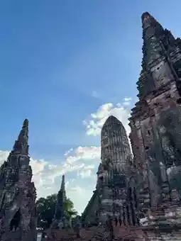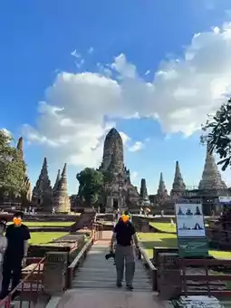 🌳 Ploy has been to Wat Chaiwatthanaram for a long time. The last time was when I was in elementary school. Because I came to visit a friend's ordination ceremony, I had the opportunity to visit with a group of friends. Ploy did not rent a Thai costume, but my girlfriend rented one. It started at only 200 baht. Hair, makeup, and various props are provided. The Thai costume rental shops are in front of the temple, lined up long. You can choose a shop. Some shops, if you rent a costume, you will get free parking. But Ploy got parking at the temple, so I was very lucky.