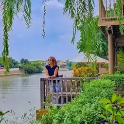 The atmosphere is along the river, with a view of the Prang and the old pagoda of Wat Phutthaisawan, which is opposite. There are many seats, both in the air-conditioned room and outside.