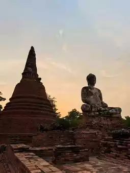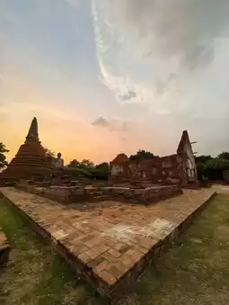 In the evening, Wat Worachettharam has a peaceful and beautiful atmosphere. The sunlight through the ruins of the old pagoda and temple creates beautiful shadows and light, perfect for taking pictures and walking around to experience the tranquility of the place. Although the temple is in a deserted state, it still has interesting architectural elements such as a large bell-shaped pagoda and a temple with a pediment decorated with pottery, reflecting the art of the middle Ayutthaya period.