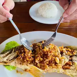 🌟Recommended menus: Steamed catfish curry, Choo Chee catfish, Fried sea bass with fish sauce, Tom Yum catfish, Sour curry with shrimp and cha-om eggs. 💓Personally, Ann likes the coconut milk curry menu the most, it is rich and delicious. For dessert, there are Salak Loi Kaew and Palmyra Loi Kaew, delicious and refreshing.