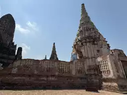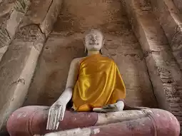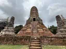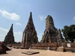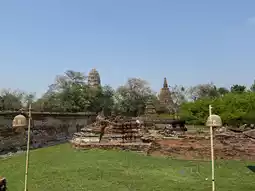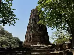 Ayutthaya is a city in Thailand, about 80 kilometers north of Bangkok. It was capital of the Kingdom of Siam, and a prosperous international trading port, from 1350 until razed by the Burmese in 1767. The ruins of the old city now form the Ayutthaya Historical Park, an archaeological site that contains palaces, Buddhist temples, monasteries and statues. The park is on an island between 3 rivers.