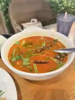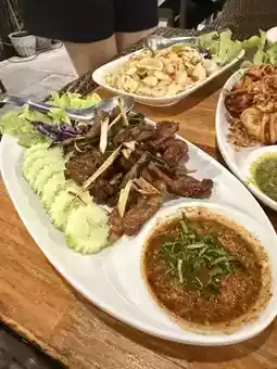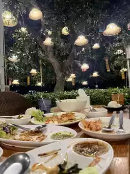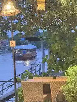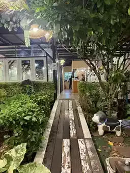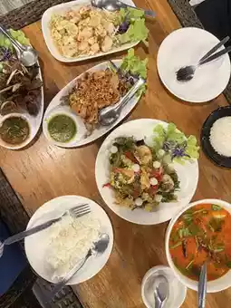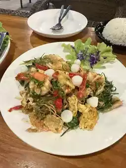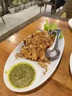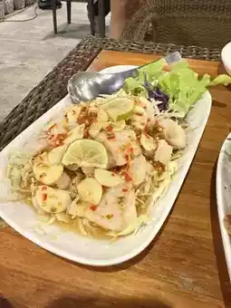 This restaurant offers a full range of savory and sweet dishes and drinks, all in one place. It's open until 10 pm, so you can sit down for dinner. The food is delicious and not too expensive, and you can enjoy the riverside view and Wat Phutthaisawan. The atmosphere is quite nice. They also have river prawns, and the creamy Tom Yum Goong soup is delicious. I like the fried squid with garlic, which is delicious and not tough at all. The restaurant has parking for about ten cars in front of the shop. If it's full, you can park on the side of the road and walk in. There are security guards who will find you a parking spot. #Get a discount without relying on luck #Cafe #AyutthayaCafe #ayutthaya #restaurant