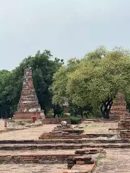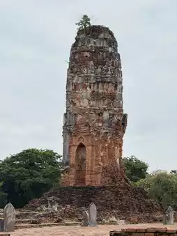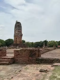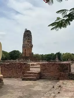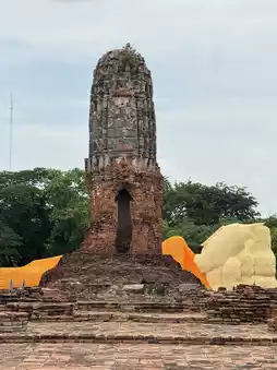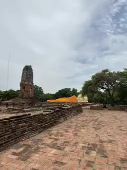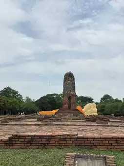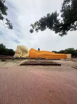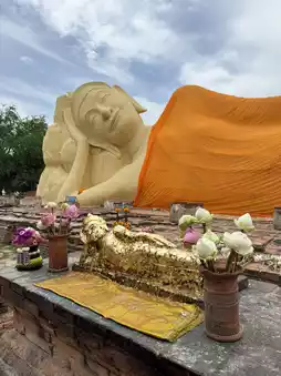 Another ancient temple in Ayutthaya that we highly recommend, Wat Lokayasutharam, is believed to have been built in the mid-Ayutthaya period during the reign of King Nakarindharathirat, the father of Chao Sam Phraya, around 1452 CE. This temple houses the largest reclining Buddha image in the island of Ayutthaya. Located outdoors, this brick and mortar Buddha image measures 42 meters long and 8 meters high. Its face faces north, supporting a lotus flower on its head. Its feet are stacked at right angles, with the toes of equal length. Lotus flowers support the head in place of pillows. It is assumed that this Buddha image was originally bare-chested, but during a renovation in 1996 CE, the head was changed to look like one wearing full attire. Surrounding the Buddha image are 24 octagonal brick pillars. A vihara may have originally been built to enshrine the reclining Buddha, but there is no evidence of its collapse. For those interested in spiritual practices, this is another popular temple for those seeking a cure for bad karma. The temple has parking and is located next to the temple, where you can offer flowers, incense, and candles. #Get a discount without relying on luck #Ayutthaya #ayutthaya #Ayutthaya temples