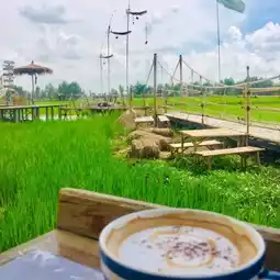 ✅ Must-Capture Elements: Wooden walkways, bamboo pavilions, rice field sunsets, coffee and smoothies