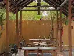 The interior is decorated in simple yet luxurious tones of wood and marble. 🪵 There's a cool coffee bar area ☕ with small wooden tables for chilling, or an outdoor area under large trees 🌳 with rows of tables and chairs, creating a calm and relaxing atmosphere. 🍃