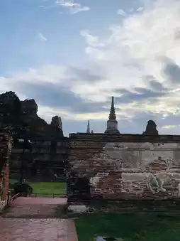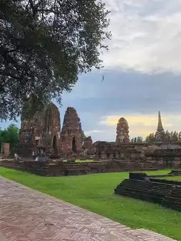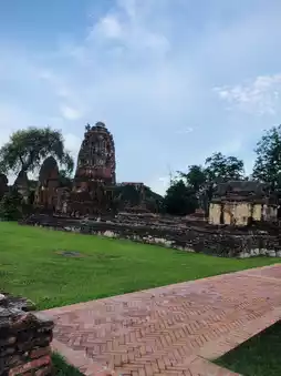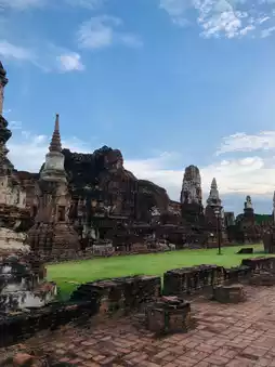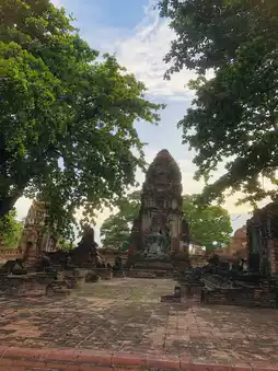 Located at the foot of Pa Than Bridge, east of Wat Phra Si Sanphet, some chronicles state that the temple was built during the reign of King Borommarachathirat I. Later, King Ramesuan ordered the relics to be enshrined beneath the base of the temple's main prang in 1384 BE. The prang of Wat Mahathat is considered the first prang constructed during the Ayutthaya period, influenced by the Prang Yom. The lower level is constructed of laterite with new additions, while the upper part is made of brick and mortar. King Prasat Thong ordered the prang to be renovated, extending it higher than before. Later, the spire collapsed, leaving only the porch. Evidence suggests that this prang was a large and exquisitely constructed structure. In 1956, the Fine Arts Department excavated this prang and discovered several ancient artifacts, most notably a stone urn. Inside, there are seven layers of stupas, each made from metal, silver, naga, black wood, red sandalwood, garnet, and gold. The inner layer contains the Buddha's relics and valuable jewelry. These relics are currently enshrined in the Chao Sam Phraya National Museum. Another interesting feature of the temple is the sandstone Buddha head, which is covered in tree roots. The head fell from the tree during the fall of Ayutthaya, and the roots have covered it. It's a unique and beautiful sight, and I highly recommend it.