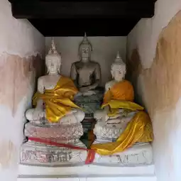 Today, I would like to take you to visit interesting points in Wat Phutthaisawan. The first point is a small chapel next to the ordination hall. Inside are three sacred Buddha images. The chapel is surrounded by fresh green trees, providing a cool and shady atmosphere. If you come to Wat Phutthaisawan, don't forget to stop by to pay homage to the Buddha images in the chapel. Next time, I will take you to see the unseen of Wat Phutthaisawan at the second point and the following points.