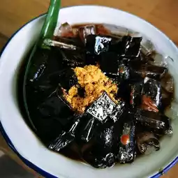 Highlights - Very delicious steak, topped with sweet and cool grass jelly.