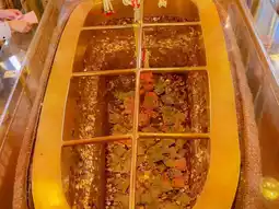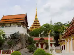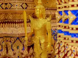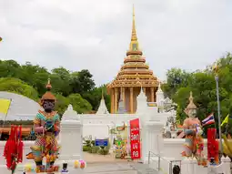 • The seven-story prang-spired pavilion, perched on a hill, houses the sacred footprint of the Lord Buddha, a key highlight. The exterior is decorated with intricate gold and blue glass patterns, giving it a grandeur reminiscent of a royal temple in Muang Thep!