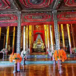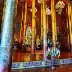 🏡The wooden pillars are lacquered and gilded, with some decorated with colored glass in Tai Yai patterns. The ceiling is also beautifully decorated with colored glass.
