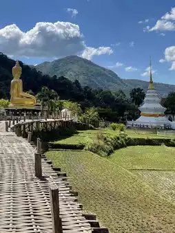 * A long bamboo bridge stretches from the Buddha statue through the fields, allowing visitors to stroll and enjoy the scenic views around the temple.