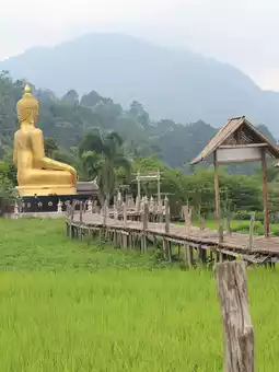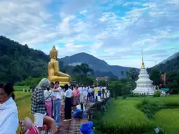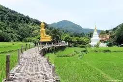 Wat Nakhuha in Phrae province is a temple with a unique feature of a large Buddha statue situated in the middle of lush green fields, surrounded by mountains and beautiful nature. This makes the temple a popular destination for tourists and pilgrims seeking tranquility and the beauty of nature.