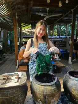 This trip, I had the opportunity to attend a tie-dye workshop at Baan Mat Jai in Phrae Province. It was even better than I expected. The atmosphere was warm and inviting, like visiting relatives in the countryside. The owner was lovely and kind, and she taught me in detail, even holding my hand.