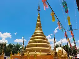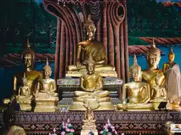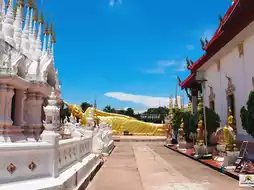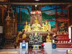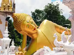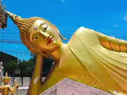This ancient temple has been beautifully restored and is one of the city's most important tourist attractions. Highlights of the temple include the large, resplendent golden reclining Buddha, clearly visible from the outside, the auspicious 19-spired archway, and the magnificent 108-spired glass chedi. Other highlights include the Phra Chao Saen Suk, a Buddha image over 500 years old, and the Phra Chao Tan Jai, a popular place for people to pray for blessings.