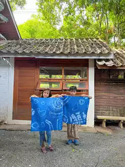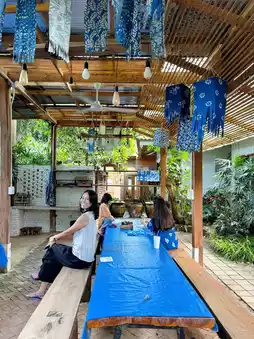 We chose to take the kids to tie-dye at Baan Mat Jai, which also doubles as a cafe. They also offer ceramic painting. Each tie-dye piece costs 150 baht. They'll teach you how to create different patterns. Then, they'll take the kids to dye their shirts by dipping them in a jar filled with indigo dye.
