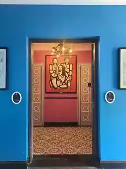The main room types are a king bedroom with pink accents or a two-double bedroom with a cute emerald green interior.
