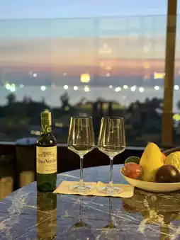 The room had a large terrace with seating area from which we had a wonderful sunset view. It was a real treat to enjoy wine, sweets and snacks with such a view.