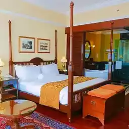 In the room, there is a TV, hair dryer, iron, and the bathroom area is separated into dry and wet zones. There is a wardrobe and dining table. Hot water kettle