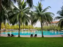 🟢 The vast swimming pool under the shadow of the coconut trees is amazingly big!