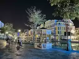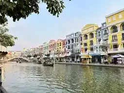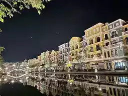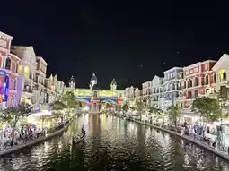 The sunset glow at Phu Quoc Grand World reflects on the gondolas reminiscent of Venice, creating a poetic scene.