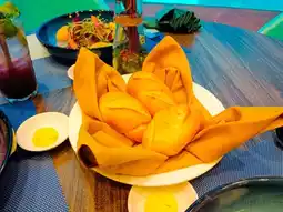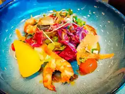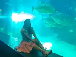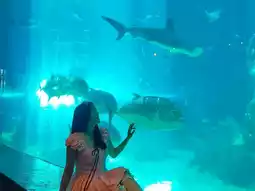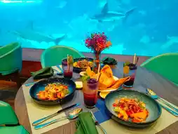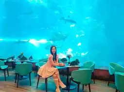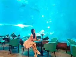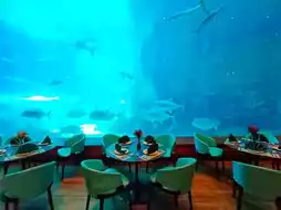 The ambiance of the restaurant is quite elegant and sophisticated, with a calm and serene atmosphere. The decor features green tones that complement the large aquarium filled with various species of fish swimming around. You'll encounter sharks, hammerhead sharks, and many other large and beautiful fish species. It's truly mesmerizing and exciting to watch them swim as you enjoy your meal, enhancing the dining experience by 3000%! The food is delicious, fresh, and of excellent quality, and the service is outstanding, with attentive staff ensuring a great experience.