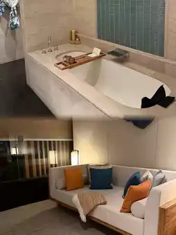 🏠 Stay Experience: The check-in process itself was a delightful surprise! The staff escorted me to a sunken sofa area where I could enjoy the sea breeze and ocean view while being served with chilled towels, tea, and snacks—the whole process was relaxed and enjoyable. I stayed in a Sky Pool Villa this time, and the moment I entered, the spacious living area and the huge terrace caught my eye. The 9m*3m private pool on the terrace was absolutely amazing, like having my own little paradise. Lighting scented candles by the pool at night created the perfect ambiance for chatting with family and friends—pure bliss. The bedroom, though not large, was cozy and warm with its soft lighting and beige furniture, and there was even a thoughtful blanket at the foot of the bed. The bathroom's celadon green color scheme was stunning, featuring full-size bottles of Perricone MD products, along with bathrobes and umbrellas ☂ adorned with the hotel's totem design.