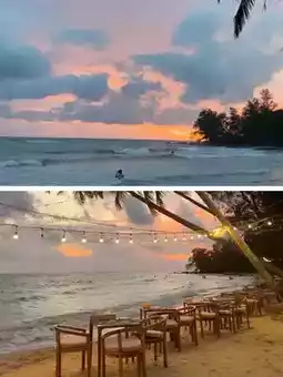 The long stretch of powdery sand and crystal-clear blue waters make it perfect for building sandcastles, collecting seashells, or wading in the shallow waves with your kids. At sunset, the sky and sea turn a stunning orange-red, creating picture-perfect moments to cherish with your family.