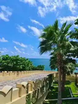 Wake up to a clear sky with palm trees lining the walkway. The sun is beautiful but the weather is not so hot that it is boring. You can walk all day long.