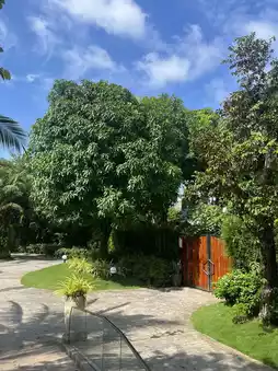 The landscaping, wooden parasols, sunbeds, and other decorations were lovely.