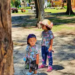 This beach is popular for people to come and lay down a mat and relax because there are many trees. And this beach, if the tide is low, we can walk across to a small island on the right. Before the entrance, there will be a tricycle selling som tam, grilled chicken, and other snacks.