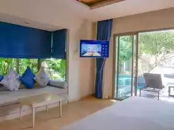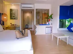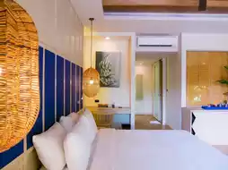 🛏 The room that Nuch stayed in was an Aqua Deluxe Pool Access. The interior of the room was decorated in warm tones, gray, white, contrasting with the bright blue of the pillows and curtains. 🖼
