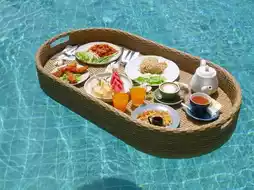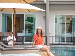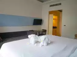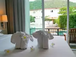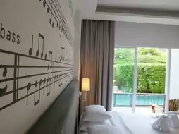 ♫ When you open the door to the room, the room is simply decorated in white tones with musical notes on the headboard. The room that Nuch got is a Jazz Pool Access room. When you open the door to the back of the room, you will see a wide swimming pool with blue-green water. Change your clothes and jump in or sit and chill on the room's balcony.