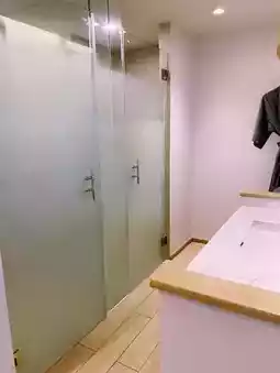 The bathroom is separated into wet and dry zones. The sink is outside the bathroom. It is clearly separated.