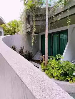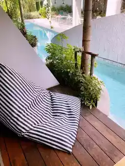 The balcony is next to the swimming pool. You can walk down to the pool and play. There is also a seating area in front of the room for you to sit and relax.