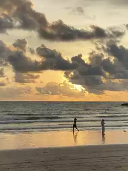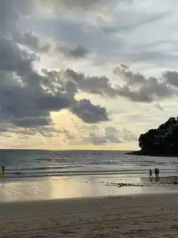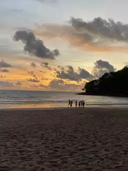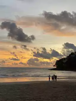 Hello, today I will take everyone to visit Phuket province. Today, I will take everyone to visit the beach and watch the sunset at Kamala Beach, Phuket (kamala beach). The atmosphere here is very good. You can see the sunset in the evening and many people flock to watch the sunset. This place is popular for taking pre-wedding photos or other photos because there are many cafes around here and fire shows at night.